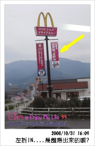 這是一間麥當勞,旗子上標明進入停車場的路線,